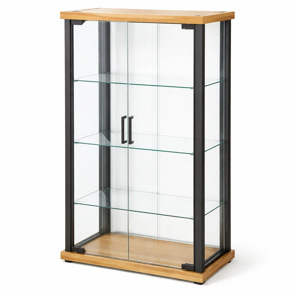 La vitrina cuenta con una estructura de metal negro y detalles de madera MDF. Sus paneles y estantes están hechos de vidrio templado de seguridad de 6 mm de grosor. La vitrina tiene tres estantes y puertas Abatible, ofreciendo un amplio espacio para mostrar colecciones o decoraciones. Dimensiones: 120 cm de altura, 80 cm de ancho y 40 cm de profundidad.