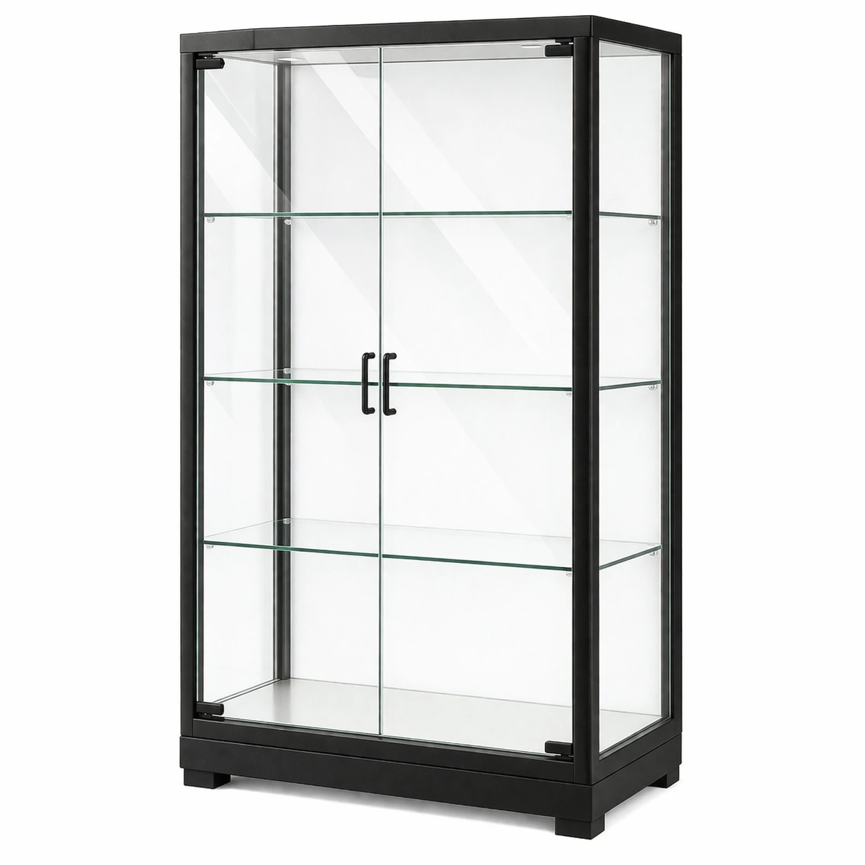 Esta vitrina está hecha de vidrio templado de 5 mm y un marco metálico resistente. Sus dimensiones son 171 cm de altura, 85 cm de ancho y 40 cm de profundidad. Cuenta con 3 estantes ajustables y puertas de vidrio de apertura doble. El diseño es autoportante.